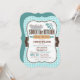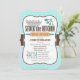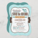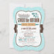 Cute Stock the Kitchen bridal wedding shower invitation on brown and aqua turquoise gingham pattern. Features retro rolling pin, mixing bowl, knife, and measuring cups cooking utensils. Invite friends to stock the bride's kitchen and pantry with food and appliances.