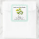 Square sticker product label with Ginkgo leaves design and custom lines of text. White labels have a pale sea-foam green border. A leafy stem in bright green, decorates the centre, with name of business at the top. Customise three more lines with name of product, information and any text needed.