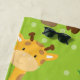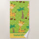 Take your children on an adventure with this cute giraffe themed beach towel. Using a green polka dot backdrop there is a giraffe and palm tree pattern that fills the design. At the bottom is a green and light brown box from inserting a name. Personalise your giraffe themed beach towel today!