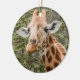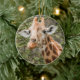 Ceramic decorative ornament with an image of a giraffe looking at the viewer over it's shoulder as it browses on green leaves in a thorn tree.
