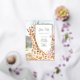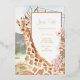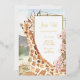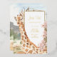 Add an adorable custom safari theme to the birthday party or baby shower of your little girl or boy with this pretty watercolor giraffe birthday party invitation. Invitation has a giraffe in front of an African savannah background and gold foil. There are also flowers and a place for your custom text.