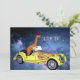 Funny postcard with giraffe in a car in space. Add your custom text.