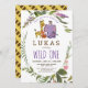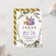 Invite friends and family to celebrate your baby's 1st birthday celebration with this sweet jungle safari animal birthday party invitation. This First Birthday Party Invitation features a giraffe, monkey, elephant, and a tiger surrounded by botanical leafing with pink and purple flowers with a yellow and brown background on the back of the invitation.