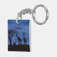 A watercolor painting of a family of giraffes adorns this customisable keychain!