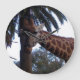 Pictured is the sweet face of a Giraffe next to a palm tree