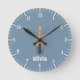 A cute blue wall clock for a kid's room or a preschool classroom featuring a cartoon giraffe riding a unicycle and spinning some plates . It can be personalize with a name .