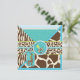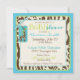 Sweet giraffe and a wild pacifier with zebra, giraffe, leopard, and cheetah patchwork prints with 3D-look lace trim ribbons baby shower invitation. Colours are blues, greens, and browns.
