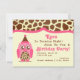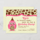 A birthday party invite featuring an illustration of a giraffe print and pink owl wearing a party hat. Matching giraffe print & pink border at top. Personalise the text with details of your occasion. Look for matching items at Jill's Paperie.