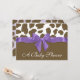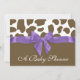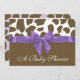 Fun brown giraffe spots and a big purple bow, little girl baby shower invitation with customisable text. All parts of this invitation are printed. There is no real ribbon attached.