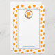 Personalised stationery with an illustration of a cute smiling giraffe face, surrounded by a wreath of tropical watercolor flowers. Colourful and cute. Background is a pattern with orange whimsical spots. A white rectangular frame with a blue border in the centre for easy legible writing. Personalise with your name along the bottom.