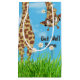 Cute giraffe with glasses and white daisy in its mouth in green grass and sky background for get well soon.