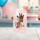 A portrait of a giraffe with pink flowers