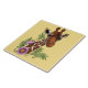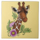 Portrait of a cute giraffe against a yellow backdrop with pink flowers.