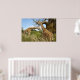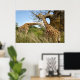 Giraffes out in the field by some trees poster