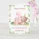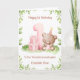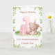 This 1st birthday card is suitable for a granddaughter or daughter. The design includes a watercolour greenery border, the number 1 in pink, and a brown teddy bear with birthday balloon, gifts and party hat.
