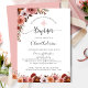 Blush pink floral watercolor girl Baptism invitation with exquisite floral arrangement on top left corner and field of flowers on card's bottom section. Flowers in gorgeous trendy blush pink, dusty rose, ivory, peach and burgundy tones. Card's back in blush pink with flower detail on the bottom. Invitation with section for "Ceremony" and "Reception" details. Coordinating products available. Part of our "Heaven in Rose" wedding and events collection.