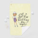 This golf towel features an elegant woman with the text "Just a girl boss building her empire". This can be personalised with your name in elegant calligraphy. It has a yellow background.