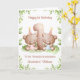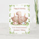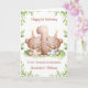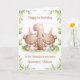 This 1st birthday card is suitable for a girl and boy twins. The design includes a watercolour greenery border, the number 1, and two brown teddy bears with birthday balloons and party hats.