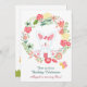 ~Personalised Cute Bunny Rabbit Sitting in a Wreath with Flowers, Butterfly and Carrot First Birthday Party Invitation for Girls. Great invite for spring, summer and the Easter holiday.