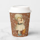 Halloween paper cups with a little girl in old-fashioned dress, carving an apple and throwing the peal over her shoulder. This was a game played by children. The apple peal was to fall indicating the initials or name of their future betrothed.