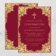 This elegant burgundy and gold confirmation invitation with a vintage air, recommended for a girl, has an ornate faux gold foil frame with meandering branches with gold leaves on a burgundy background. Above the text there is a religious cross in faux gold foil. All text can be personalised and has a golden yellow colour similar to the faux gold frame.