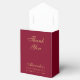 An elegant burgundy and gold favor box, for a girl's religious confirmation. The flap is faux gold foil and it has a crest with a cross in it, both of them burgundy (deep red).