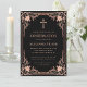 This elegant rose gold pink and black confirmation invitation with a vintage air, recommended for a girl, has an ornate (faux) rose gold foil frame with elegant baroque decorations on a black background. Above the text there is a religious cross in rose gold. Except the occasion "Confirmation", that is also in rose gold, all text can be personalised and has a colour similar to the rose gold frame.