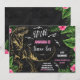 Chalkboard Invitation for Girl Dinosaur Three-Rex Birthday with tropical leaves & flowers & gold dinosaur.