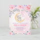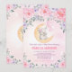 This design features watercolor illustration of an adorable baby elephant sitting on a crescent moon and gorgeous pink & lavender flowers