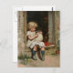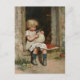 Adorable little girl bundles a cute little puppy. The girl is blonde and is wearing a white dress with pink spots and a tan apron. She sit on the threshold of the door and holds the dog wrapped in her apron. This cute vintage Victorian print was illustrated in 1891 by Harriett M. Bennett.