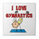 A stick figure girl does a handstand on the mat practicing her floor routine and text reads "I Love Gymnastics" on girl gymnast T-shirts, mugs, tote bags, mousepads, stickers, cards, and other girl gymnast apparel and gift items.