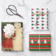 Vintage Christmas of Girl in a red coat protecting a Snowman with a green umbrella. Wonky red and green plaid trees on white. Red, green and white Christmas stripes with white Christmas trees. Fun collection of red, green and white wrapping paper for the holiday season.