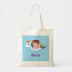 A tote bag with a cute little girl in a pink striped swimsuit in an unicorn pool swim float that has bright and colourful rainbow mane, tail, pink stars and horn. Personalise with child's name. Great for summer!