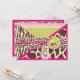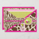 Wild and fun monkey hanging on jungle vine and a wild pacifier with zebra, giraffe, leopard, and cheetah patchwork prints with 3D-look lace trim ribbons baby shower invitation. Colours are pinks, greens, and browns.