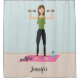 The shower curtain features Destei's cartoon illustration of a brunette girl who is holding dumbbells in her hands. The girl is standing on a pink mat that has two dumbbells on it and a blue water bottle. Under the image there is a personalizable text area for a name.