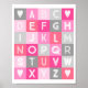 Modern geometric squares alphabet nursery art print in light pastel pink, hot pink, fuchsia, coral and grey for baby girls.