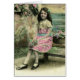 Coloured old-fashioned postcard of a girl sitting on a bench with wildflowers in a basket and a bouquet.