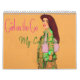 Girl on the Go 2026 colorful Calendar by Artist. Shows dark haired chic girl in green designer outfit walking in various versions. Original art.