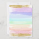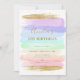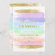 This editable pastel birthday party invitation sets the tone for your pastel rainbow theme birthday celebration. The AMITOLA Collection features a cute design with a white background and watercolor paint brush strokes in pastel colours of the rainbow, with gold paint strokes and stars along the top and bottom. A pairing of script and serif fonts in gold and grey with all editable text completes this girl's 5th birthday invitation for a pastel birthday party.