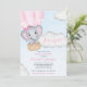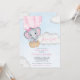 This whimsical baby shower invitation features an adorable baby girl elephant flying among the clouds in a pink hot air balloon on a blue watercolor background. Easy to personalise with custom options by clicking the "Personalise" button.