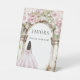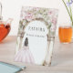 A pink floral garden arch with a girl in a pink dress. Text: Favors. Please take one!