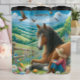 This peaceful and idyllic scene depicts a young girl wearing a straw hat sitting contentedly beside a large, gentle brown and white horse lying in a field brimming with colourful wildflowers. Rolling green hills stretch into the distance under a bright blue sky dotted with fluffy clouds, soaring birds, and fluttering butterflies, creating a serene and heartwarming image of companionship and nature.