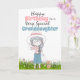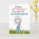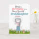 A beautiful illustration of a hand drawn pretty young girl wearing a white hat with a pink ribbon and a denim skirt and striped short sleeve top. She is standing holding her hat on her head with one hand and in the other has the lead of her cute little brown dog. They are standing in a field filled with pretty cosmos wild spring flowers. The words, happy birthday to a very special granddaughter (which may be changed to daughter, niece, godchild etc) appears on a white background and the inside has a lovely tender message which should be customised to suit whatever family relation you have inserted on the front.