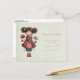 Save the date postcard with a cute retro image featuring a whimsical girl with rosy cheeks and flowers in her hair. Carrying a green frog doll.