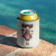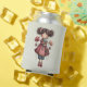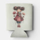 A can cooler with a cute retro image featuring a whimsical girl with rosy cheeks and flowers in her hair. Carrying a green frog doll.