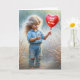Cute little girl wearing denim ripped blue jeans and holding a red heart balloon in a country field for a 60th birthday.