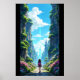 A young girl with a backpack walks down a stone path through a vibrant canyon filled with trees and flowers, heading towards a distant futuristic city under a bright blue sky. Clear details