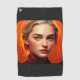 A girl with blue eyes on an orange background, dark black and crimson, photorealistic fantasies, personal iconography, detailed character design, shiny/glossy