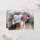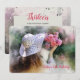 A beautiful image of a young girl, with her back turned, holding up a bouquet of pink flowers. She has long brown hair and is wearing a hat. (Pix). <br/><br/>The card is easy to customise with your wording, font and font colour.<br/><br/>Not exactly what you're looking for? All our products can be custom designed to meet your needs at no extra charge.<br/><br/>Simply contact us at askcottonlamb@gmail.com.<br/><br/>Coordinating products available: Just ask us!
