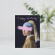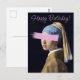 Pop art vintage remix of Girl with pearl earing with a pink brush stroke. Happy birthday greeting.